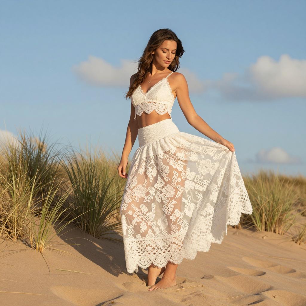 Photograph of a woman sitting on sandy beach. She has long brown hair, wearing a wide-brimmed white hat, gray dress, and black-and-white cowboy boots. Her legs are spread apart, and she holds a black bag. Sand, dry grass, and shadows are in the background. Her face is mostly obscured by the hat.
