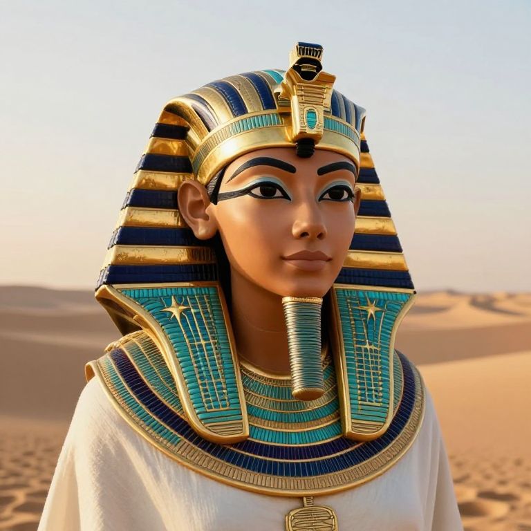 Photorealistic digital artwork of an Egyptian woman with dark skin, blue and gold striped headdress, turquoise and gold collar, white robe, in a