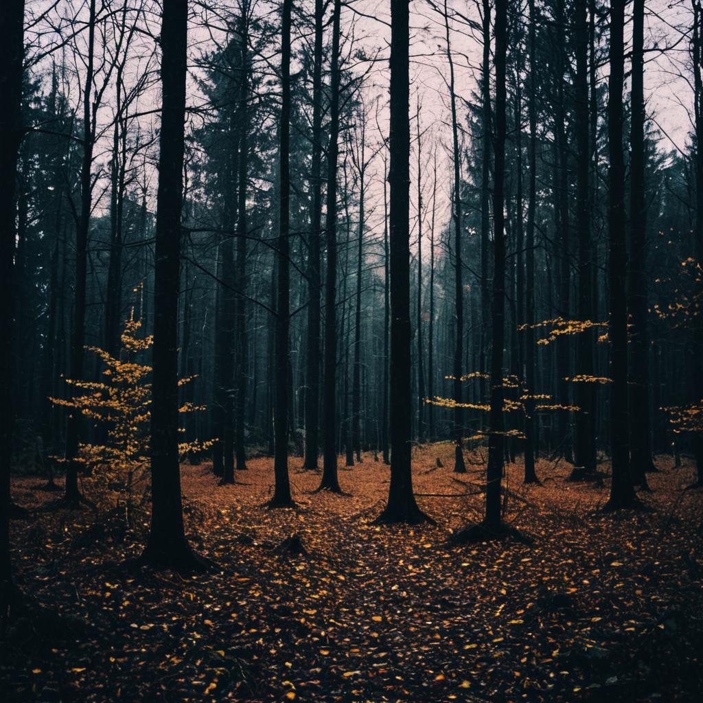 Dark tall trees in a dense autumn forest with the sun setting in the background, casting an orange glow over fallen leaves and creating a mysterious, serene atmosphere.