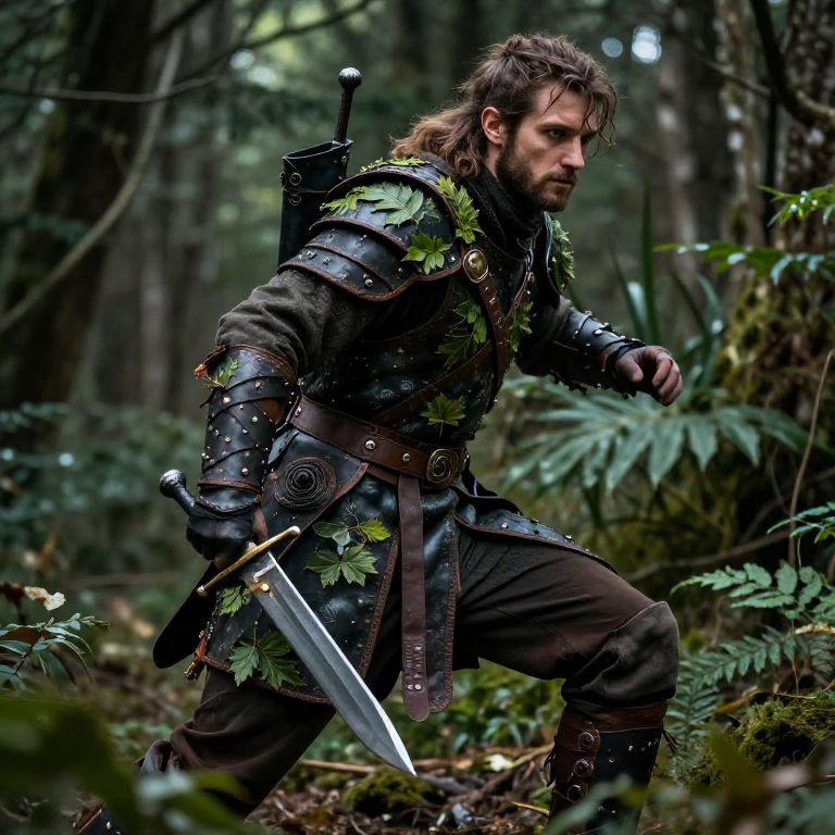 Photograph of a medieval warrior in shiny, brown leather and steel armor with chain details, standing in a forest. Dark, blurred background. Focus on