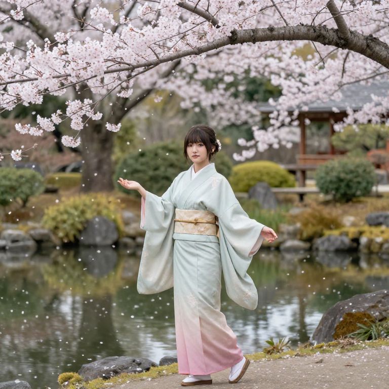 Woman in Traditional Kimono by Cherry Blossom Pond