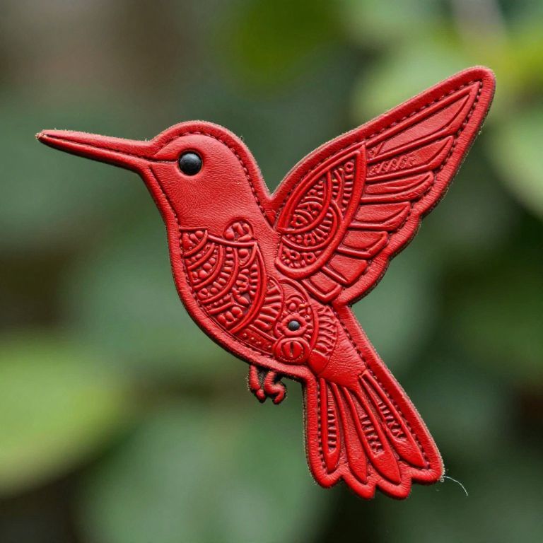 Vibrant red leather hummingbird patch, intricately handcrafted with detailed mandala patterns, soaring against a blurred green backdrop, symbolizing artistry and tradition from Oaxaca, Mexico.