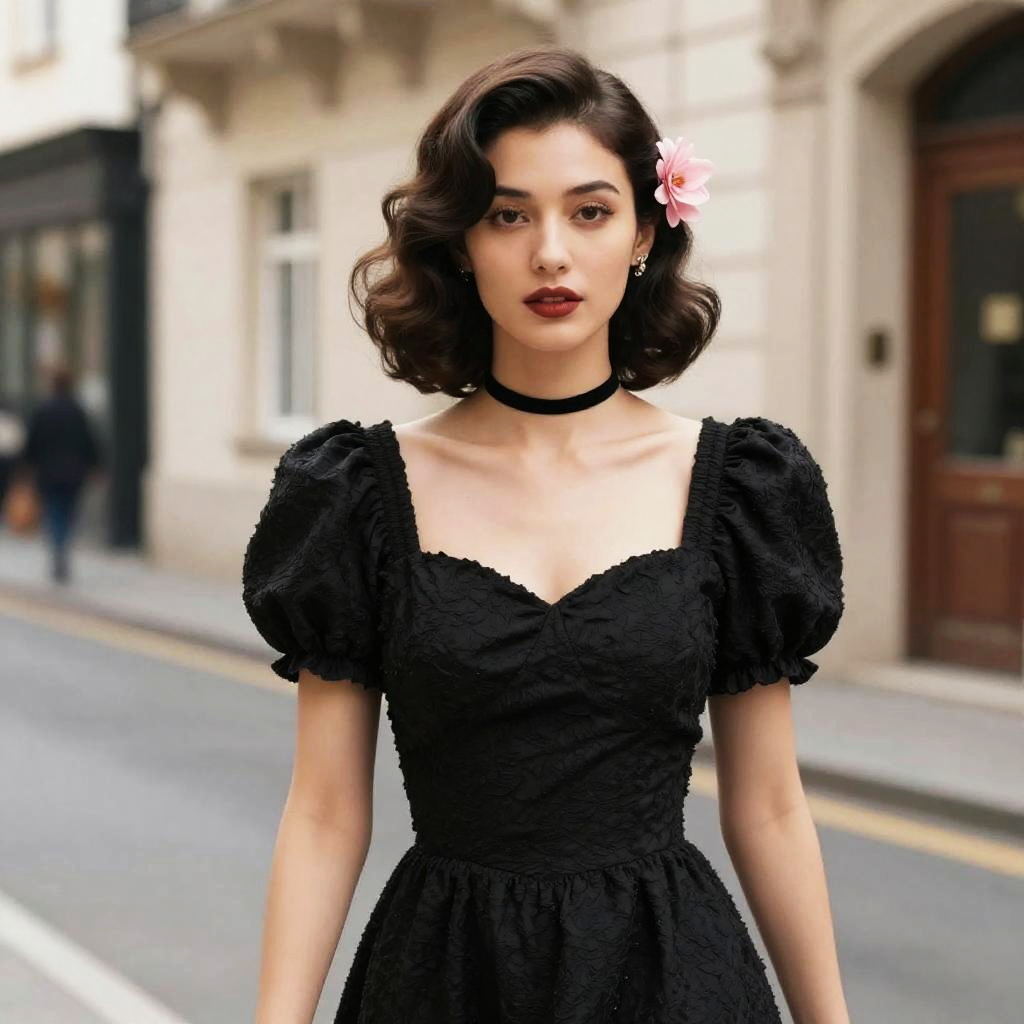 Woman, romantic vintage, black textured dress with low-cut neckline and puff shoulders, choker, hair styled in soft waves with a side part adorned with a pink flower, town street background.