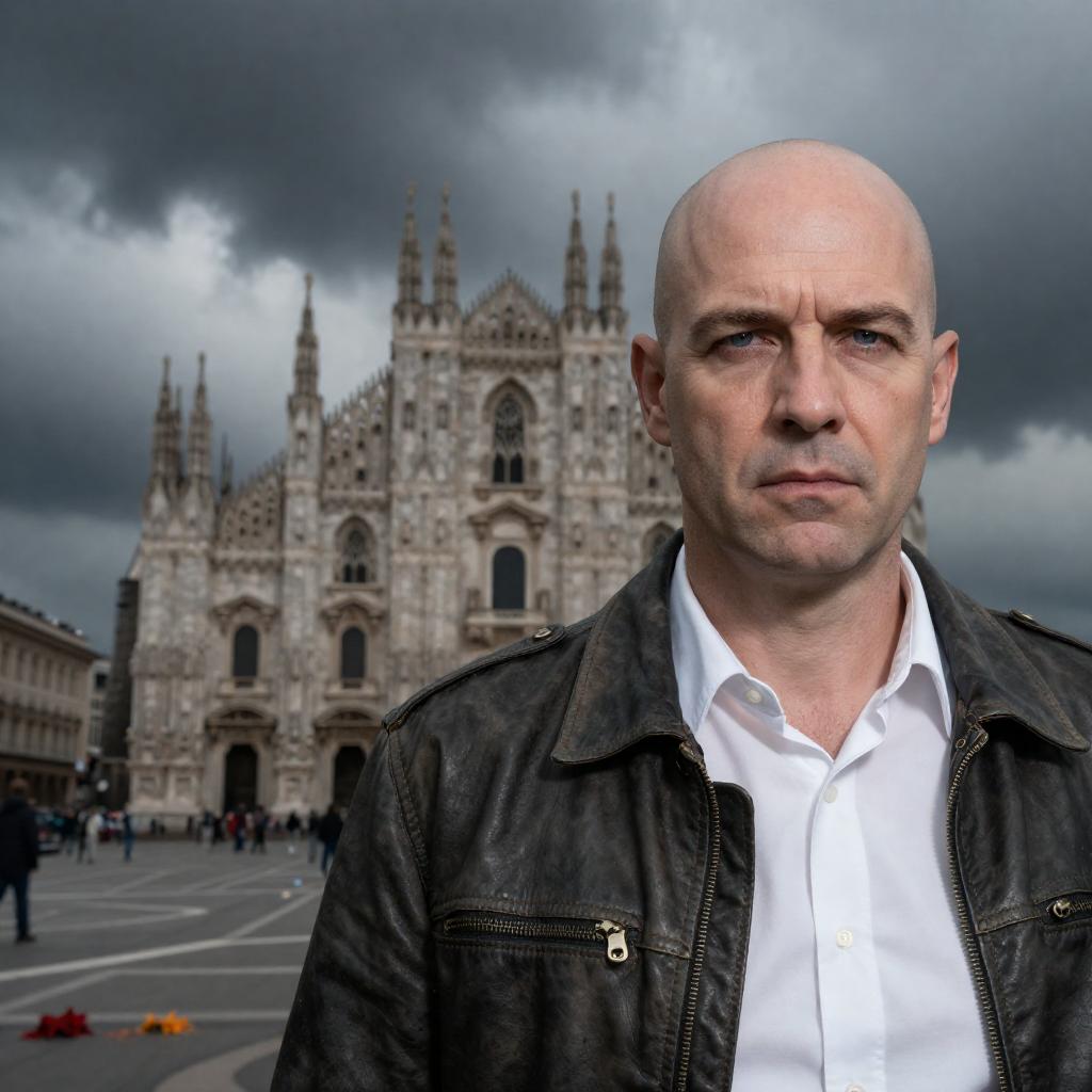 Photograph of a bald middle-aged man with a serious expression, wearing a dark leather jacket over a white shirt. Background features a stormy sky with dark clouds and a distant, partially obscured, ornate cathedral. Splattered colors and debris in the midground. The man is in the foreground, slightly to the right, with the cathedral centered in the background.