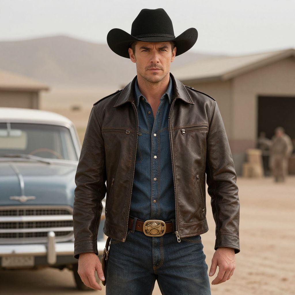 Photograph of a muscular Caucasian man with short brown hair, wearing a black cowboy hat, dark brown leather jacket, blue denim shirt, and blue jeans with a large silver belt buckle. He stands in a dusty, desert-like setting with a vintage blue car and a beige building in the blurred background. His expression is serious, and he is slightly leaning forward. The scene has a rugged, Western vibe with muted colors and a clear, bright sky.