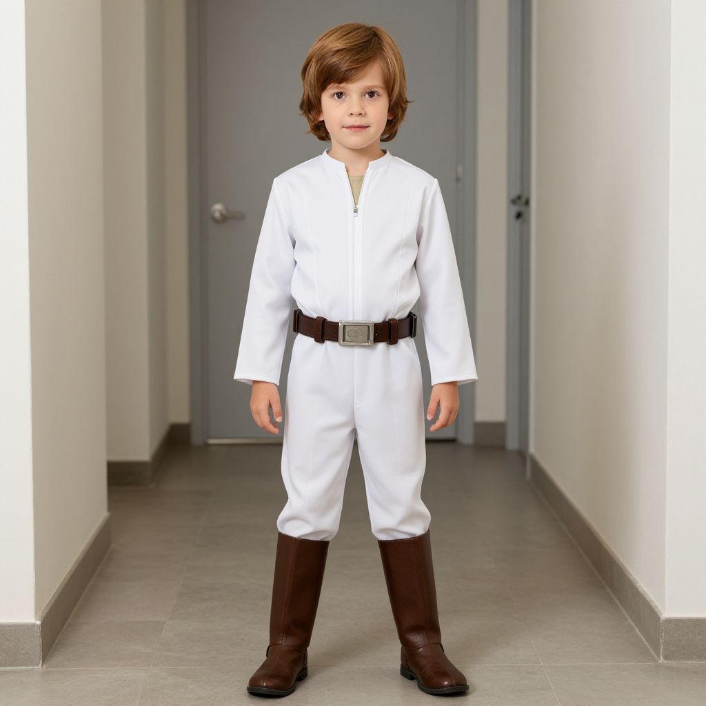 Kid Luke Skywalker Costume, child dressed in a star wars costume standing in a hallway