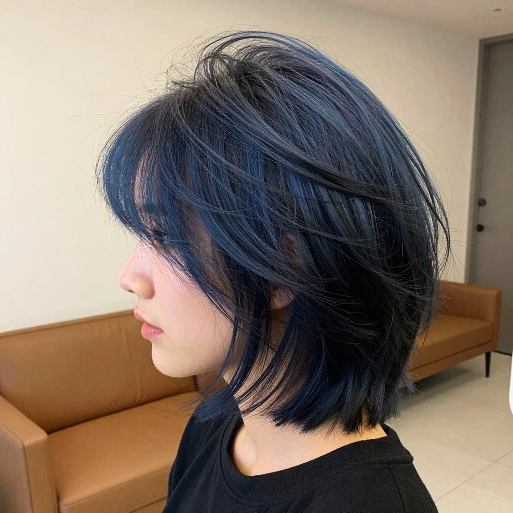 Blue front hair styled in a messy bob with subtle highlights, casual indoor setting with cozy atmosphere, soft shadows and warm light, emphasis on texture and natural expression, contemporary fashion, realistic illustration with fine details.