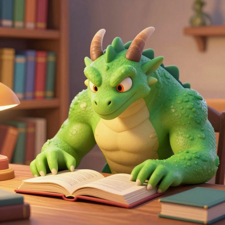 A vibrant CGI image depicts a green, furry, horned monster with large white teeth, sitting at a wooden table in a dimly lit library. The monster, with a slightly mischievous expression, is reading an open book with both hands. Surrounding the table are tall bookshelves filled with colorful books, adding to the cozy, intellectual atmosphere. The floor is wooden, and scattered papers are visible on the floor. The background includes a dark wooden door. The image has a playful, fantasy style with rich, warm colors and detailed textures.