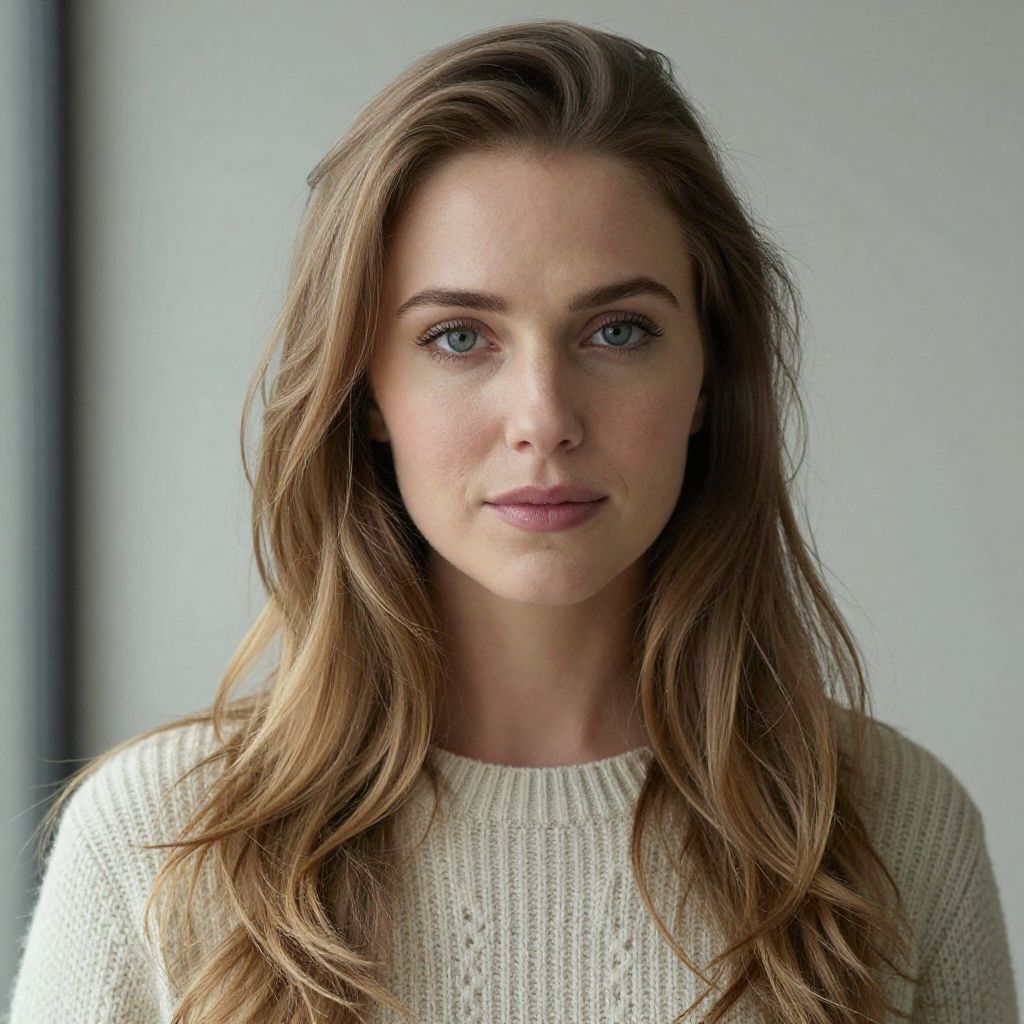 Photograph of a young woman with fair skin and long, wavy, light brown hair, wearing a cream-colored knitted sweater. She has blue eyes, subtle makeup, and a neutral expression. The background is softly blurred with a light gray color, creating a minimalist and modern look. The image is well-lit with natural light, highlighting her facial features and hair texture. The overall composition is centered and focused on her face, exuding a calm and serene atmosphere.