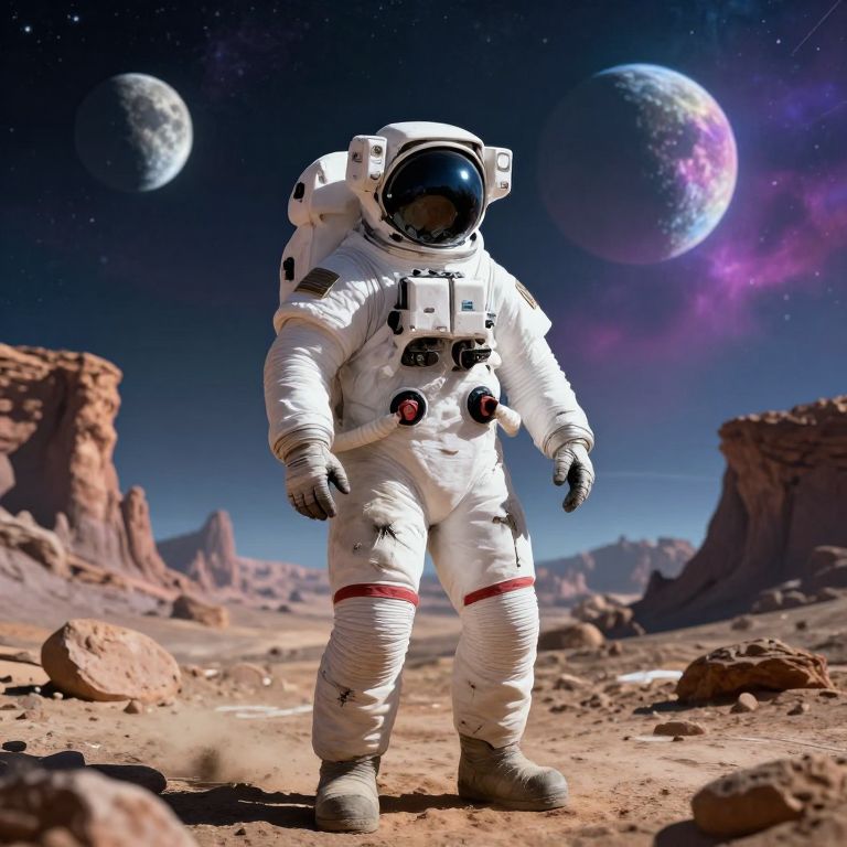 Photorealistic CGI: Astronaut in white spacesuit with black and red accents, standing on rocky Mars terrain, two colorful planets in starry sky