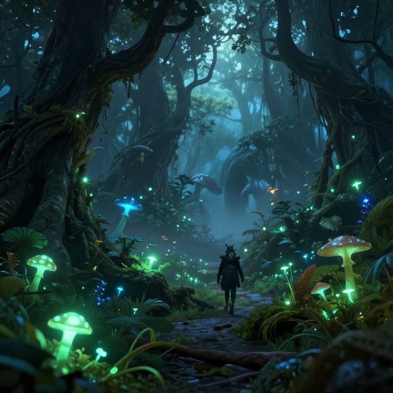Digital fantasy artwork of a dark, enchanted forest at night, illuminated by glowing mushrooms, fireflies, and bioluminescent plants, with a lone