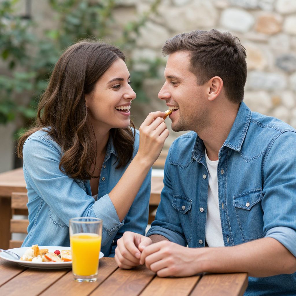 Photograph of a happy couple eating outdoors at a wooden table. The woman with long brown hair, wearing a blue denim shirt, is feeding a bite to the man with short brown hair, also in a blue denim shirt. They're smiling at each other. There's a glass of orange juice and a plate with food on the table. The background shows blurred greenery and a stone wall.