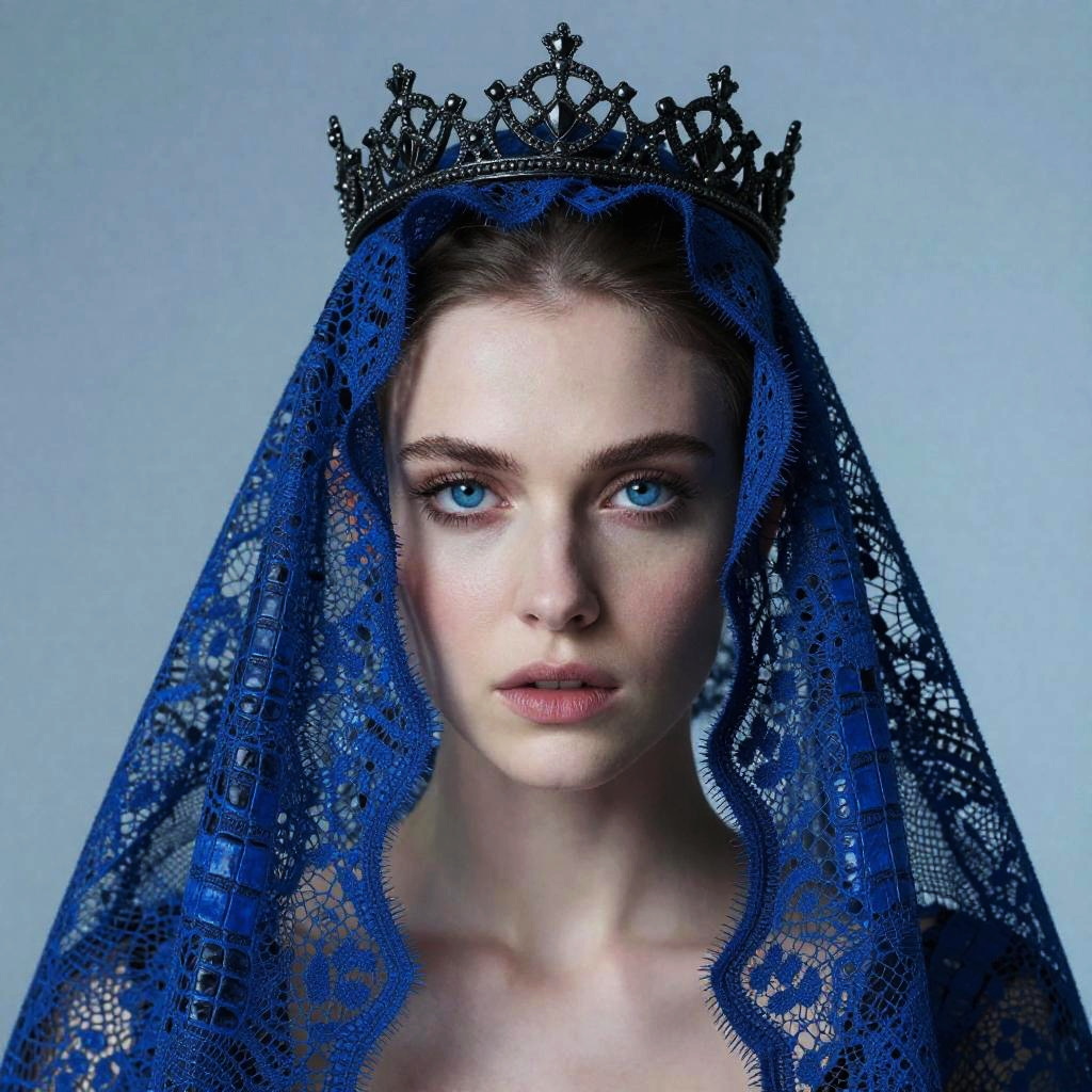 Photograph of a fair-skinned woman with striking blue eyes, partially covered by a blue lace veil that has a crocodile skin texture. She wears a black crown with intricate details, and the light highlights her pale complexion. The background is a soft, gradient blue that complements her veil and eyes. Her expression is intense and mysterious.