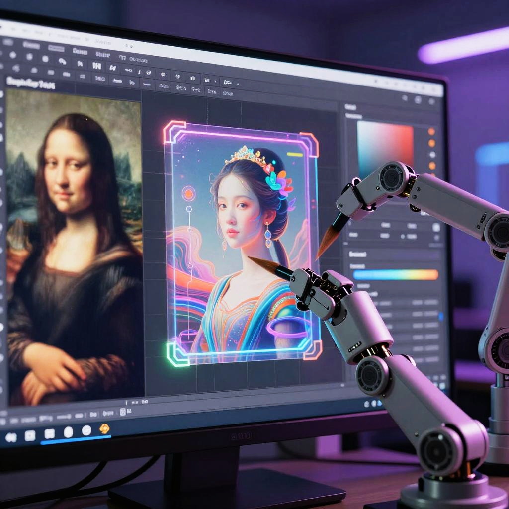 Photograph of a digital art workstation featuring a computer monitor displaying two images side-by-side. On the left, a traditional painting of a woman with long dark hair in a Renaissance-style dress. On the right, a digital artwork of a woman with East Asian features, adorned with flowers in her updo, surrounded by vibrant neon lines and a glowing square frame. A robotic arm with white and black joints is positioned in front of the monitor, pointing towards the digital artwork. The background is a dimly lit room with purple and blue lighting, highlighting the monitor. The overall style blends traditional and digital art.