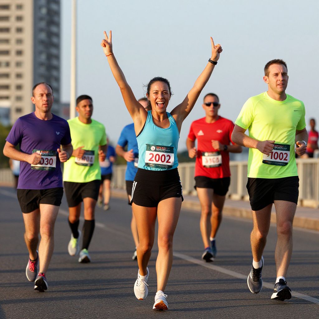 Sunset-lit runners cross a city bridge, with a joyful brunette woman in the foreground raising her arms triumphantly, wearing bib number 2002, as other participants in vibrant athletic gear follow closely behind.