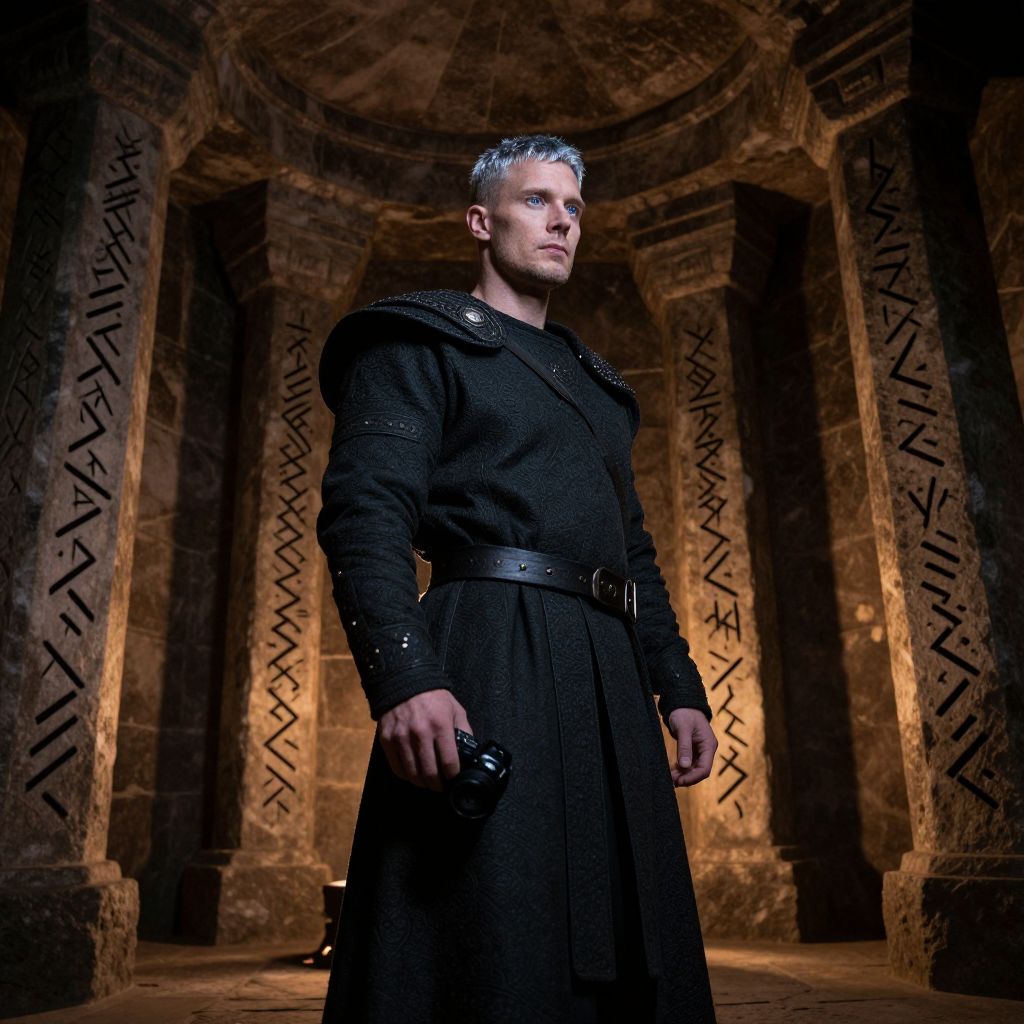 A stoic Nordic man with piercing ice-blue eyes and short hair, subtly flecked with silver, stands tall amidst a circle of rune-covered pillars in an ancient stone chamber. His rugged features are illuminated by the warm glow of a flickering fireplace, casting intricate shadows on the weathered walls around him. Captured using a mirrorless camera from a low angle, this ultrarealistic portrait exudes an air of mystery and ancient wisdom. It evokes a profound emotional gradient, seamlessly blending nature's raw power with an ethereal aura of primordial magic.