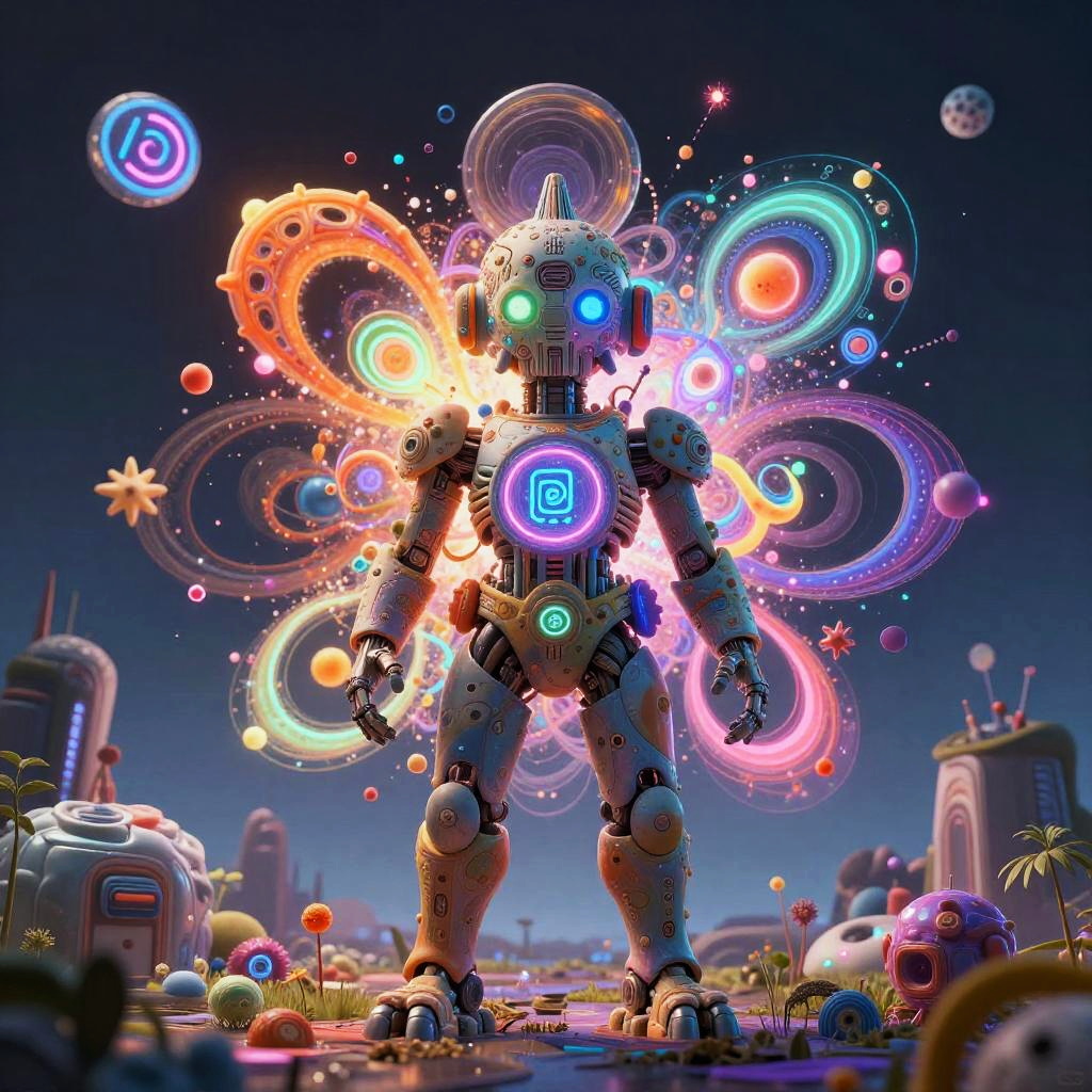 AI generator concept art, a surreal mechanical device blending organic and robotic elements, emitting streams of colorful digital particles and abstract data flows, futuristic environment with a blend of science fiction and fantasy aesthetics, vivid colors