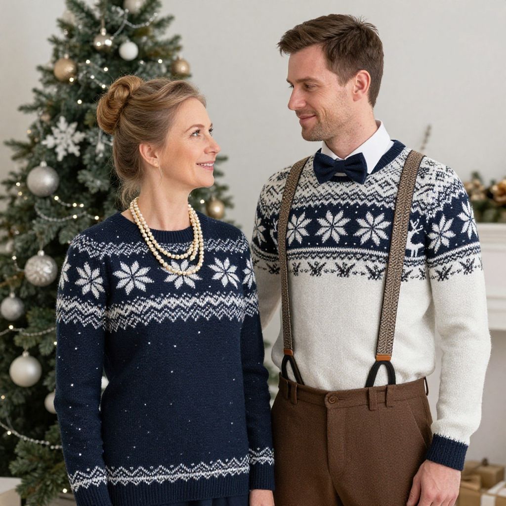 Aunt Bethany and Uncle Lewis costume, intricate knit sweaters with snowflake and reindeer patterns, Aunt Bethany with a pearl necklace and bun hairstyle, Uncle Lewis with a bow tie and suspenders, festive indoor setting with Christmas tree