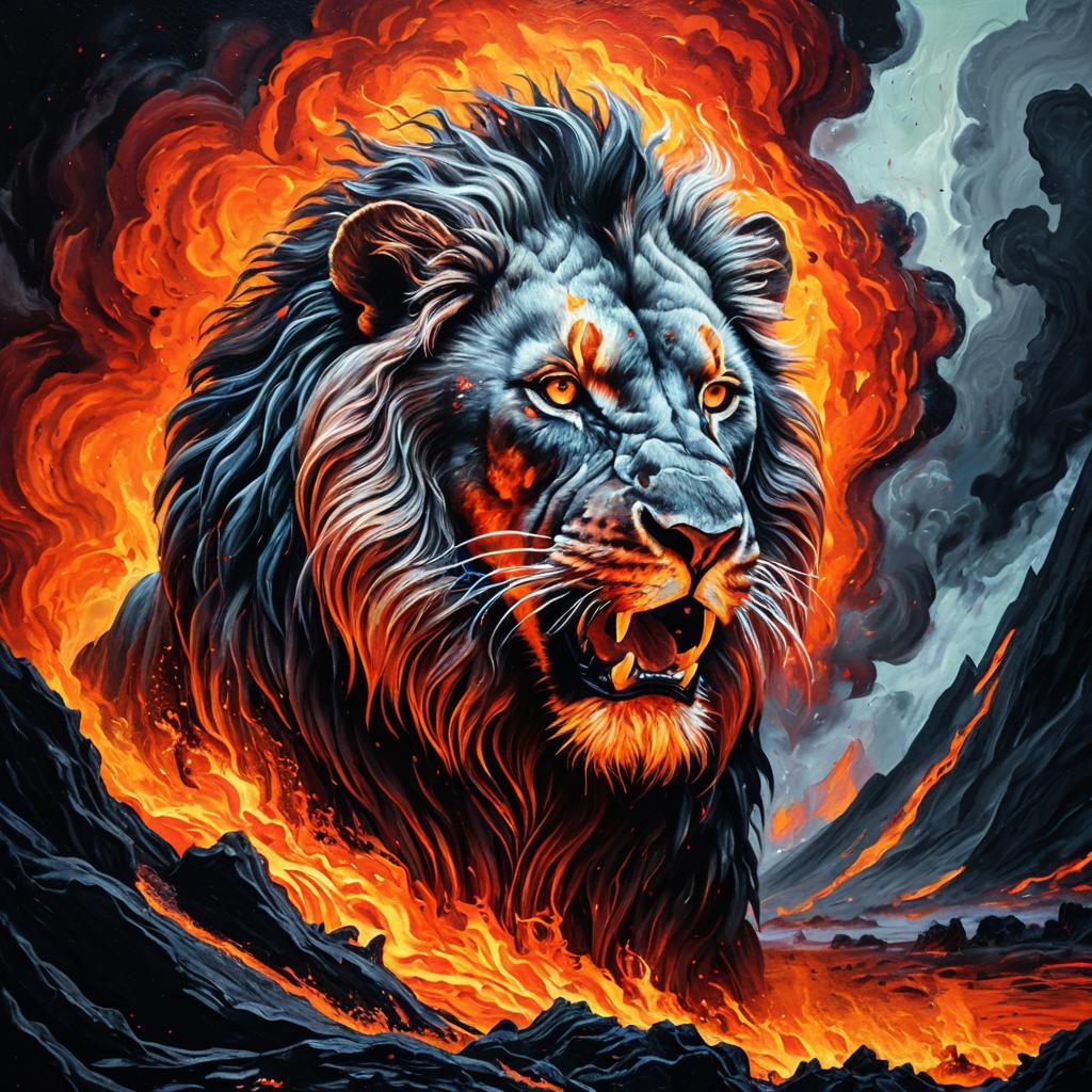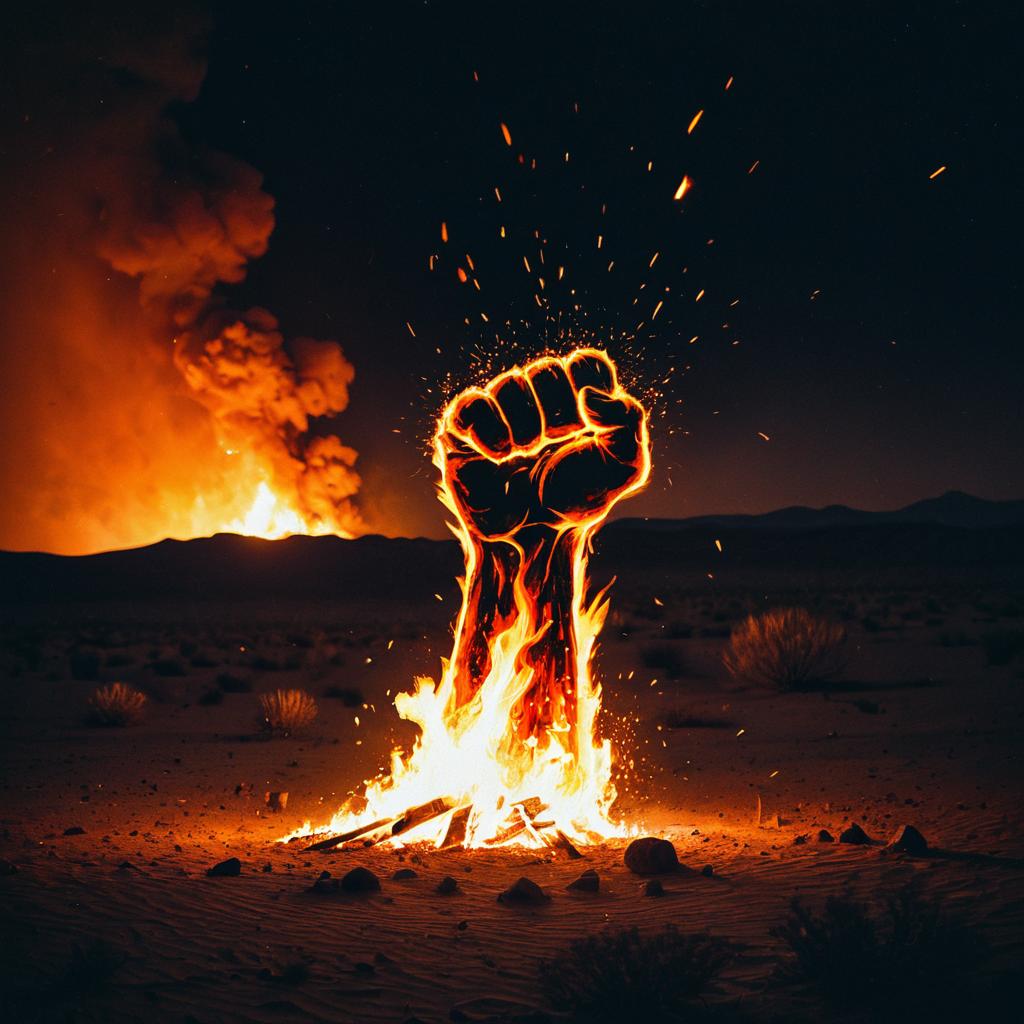 Fire painting of a fiery fist crashing down in a scorched desert, with vivid fire textures and intense atmospheric lighting.