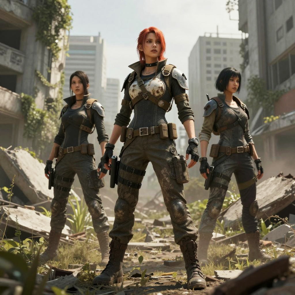 Photorealistic CGI of three tough, red-haired, armored women with guns standing confidently in a ruined, overgrown urban landscape.