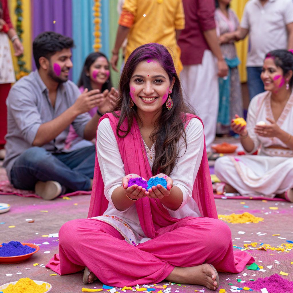 Radiant smiles and vibrant pink hues adorn a joyful celebration as a woman sits amidst colorful Holi powder, her hands cradling a handful of pigment, surrounded by festive confetti and a backdrop of playful chaos.