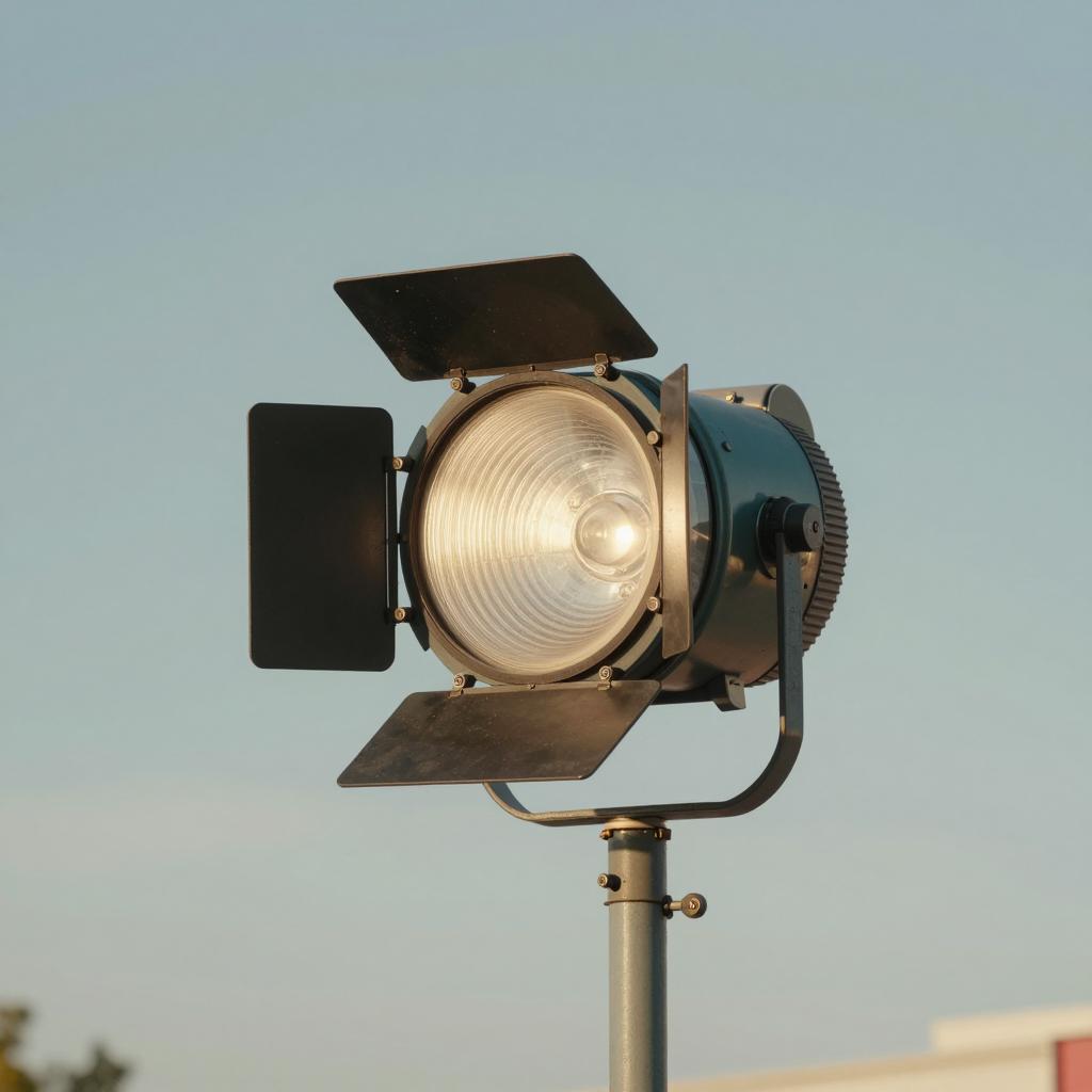 Retro Gaming professional photo of an old theater fresnel light floating in the sky, surreal, slightly pastel colors, lots of negative space, circus, warm soft sunlight lighting, photograph, f/8, adobe rgb, professional photography, high quality, ambient occlusion, cinematic, super details, sharp,