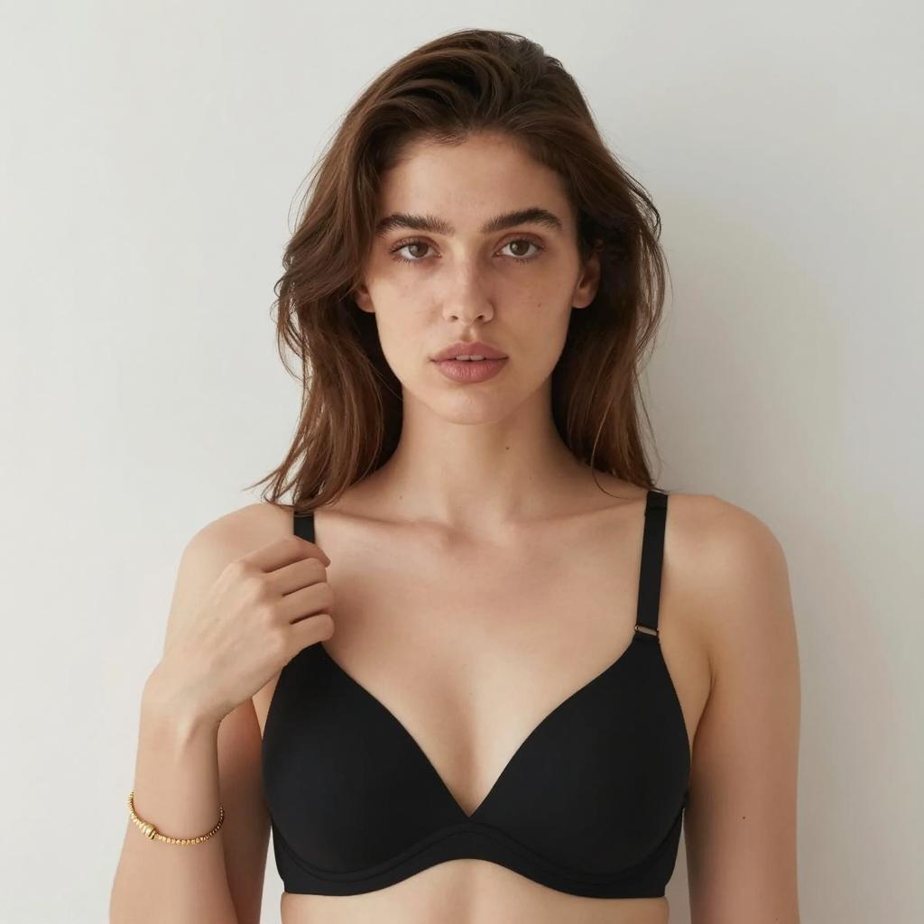 Woman with long brown hair in black bra, standing in tiled bathroom, hands on hips, looking to the side, slightly tense expression. Checkered grey and white tiles, blue and green bottles on left.