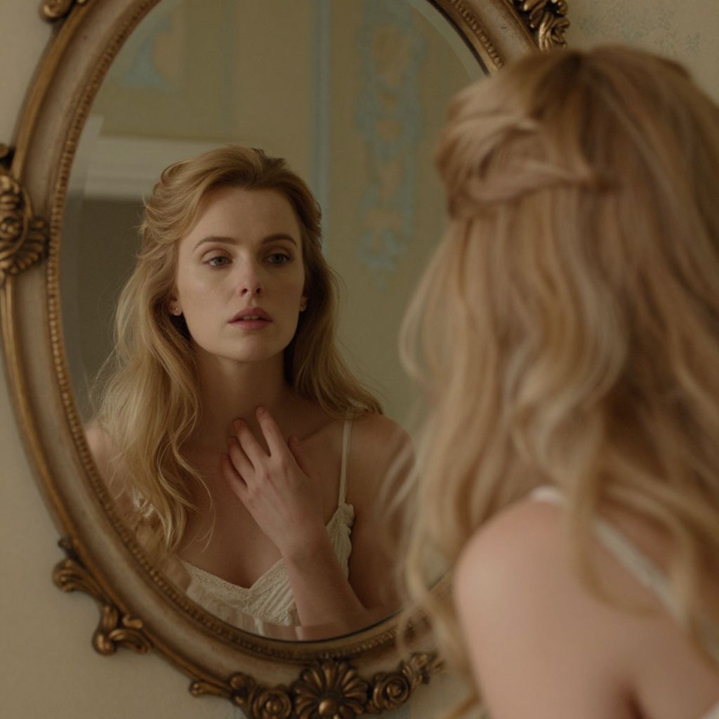 Photograph of a blonde woman with wavy hair, wearing a white lace top, standing before an ornate oval mirror, gazing intently at