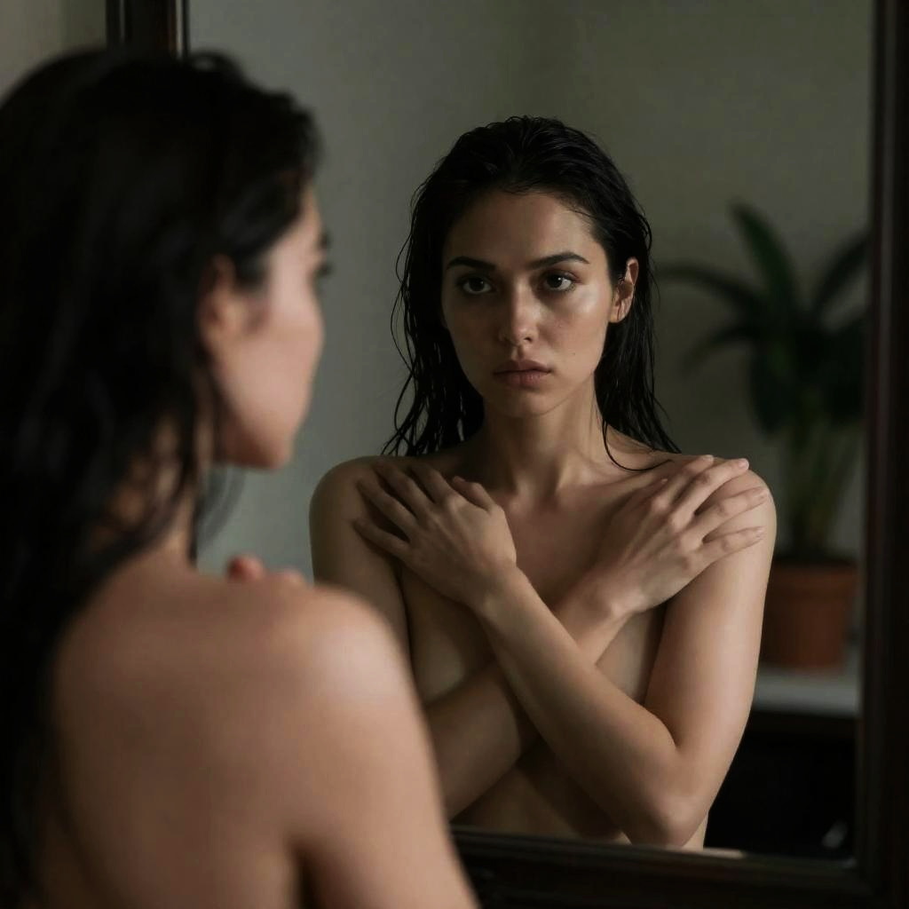 Topless woman with dark hair in a bun, wearing dark sunglasses, stands in a dimly lit room. Reflection in mirror shows partial face. Wall with small patterned ure. Roll of toilet paper on right. Neutral facial expression. Background is softly lit.