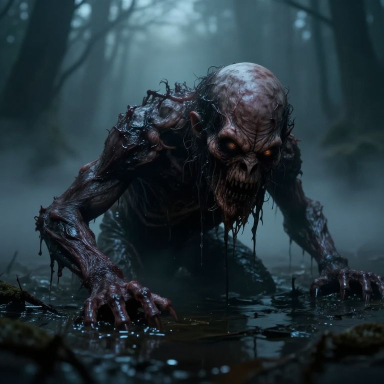 Horror AI image generator depicts a monstrous creature with distorted humanoid features crawling out of a foggy swamp, skin covered in slimy textures, eyes glowing unnaturally, nocturnal setting, hyperrealistic gothic horror art with unsettling atmosphere.