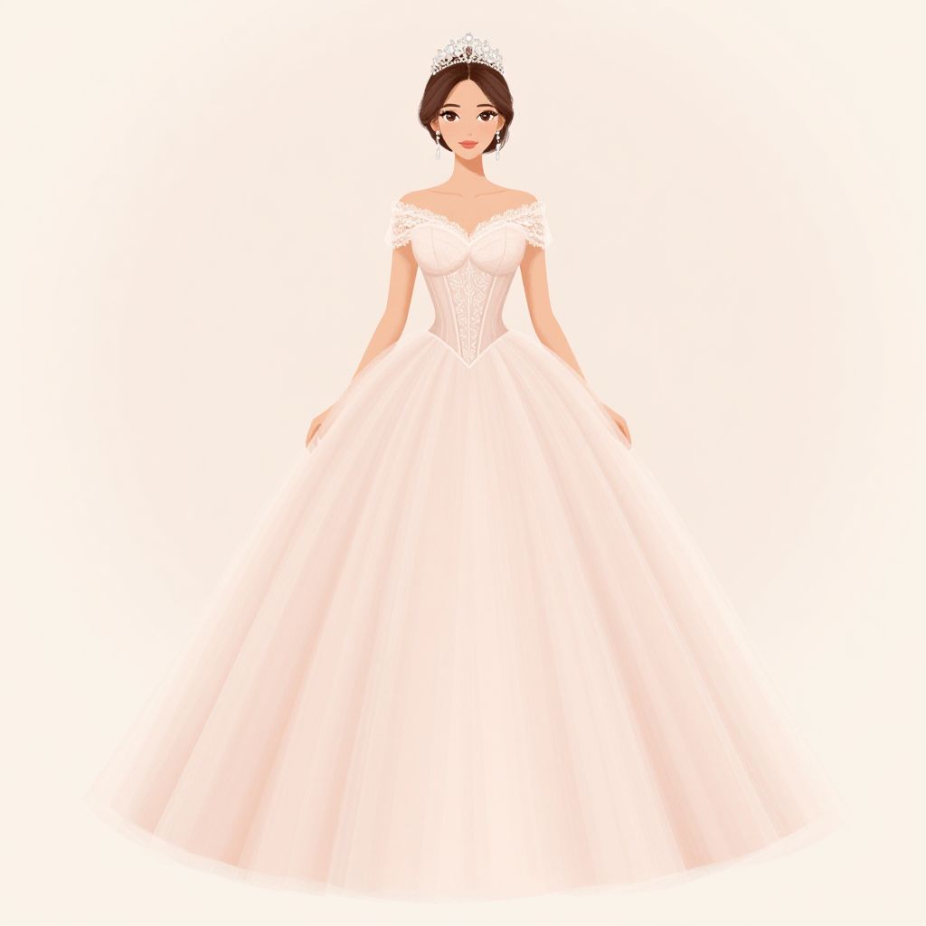 Elegant illustration of a woman in a blush-colored ball gown featuring a corseted bodice adorned with lace detailing, flowing tulle skirt, and complemented by a sparkling tiara and dangling earrings, set against a soft pastel background.
