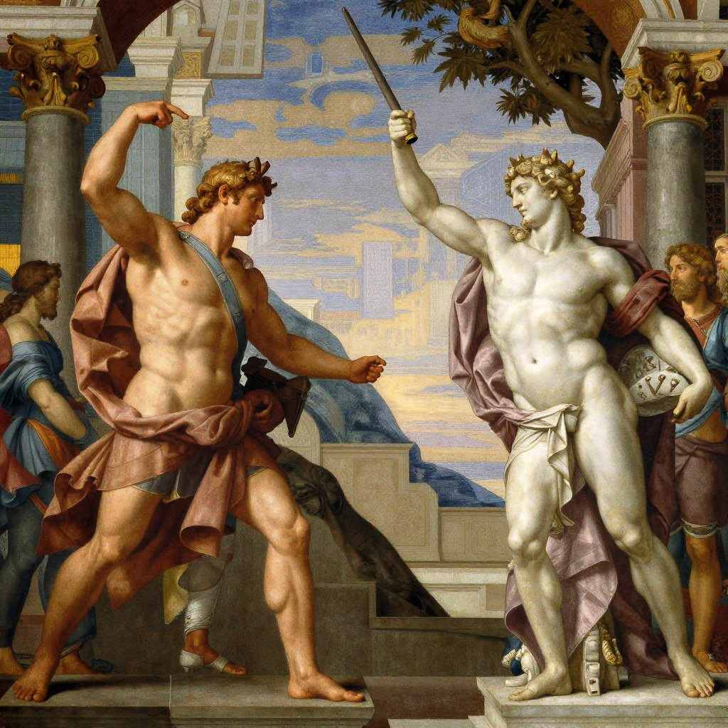Whipping scene, classical mythology theme, Greco-Roman setting, muscular figures, marble columns, golden hour lighting, epic scale, inspired by Renaissance frescoes