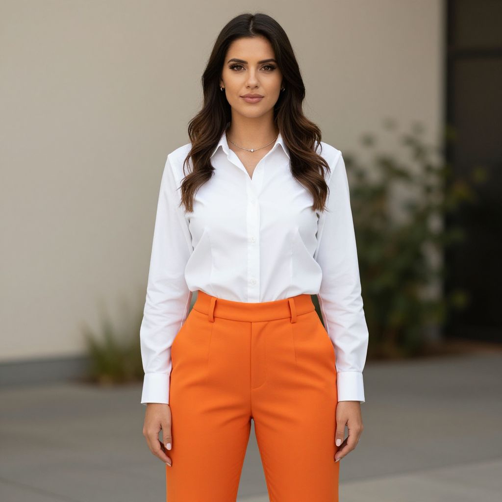 Photograph of a woman with long, wavy dark brown hair and olive skin, standing outdoors. She wears a crisp white long-sleeve blouse, buttoned up, and high-waisted, bright orange trousers. Her expression is neutral, with a slight smile. She has a small gold necklace and subtle makeup. The background is slightly blurred, showing a white wall and some greenery. The image has a modern, professional style, emphasizing her stylish, vibrant outfit. The lighting is natural, highlighting her outfit's colors and textures.