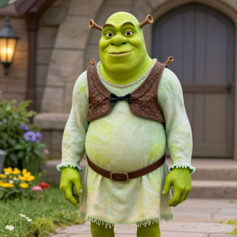 Photorealistic CGI image of a green-skinned, humanoid ogre with a round belly, small antler-like horns on his head, and a friendly smile. He wears a white, frilled dress with a brown, textured vest and a brown belt. His large hands hang by his sides. The background features a stone building with a wooden door, a lit lantern, and a garden with colorful flowers. The ogre stands on a stone path, creating a whimsical, fairy-tale-like setting. The image has a vibrant, detailed texture.