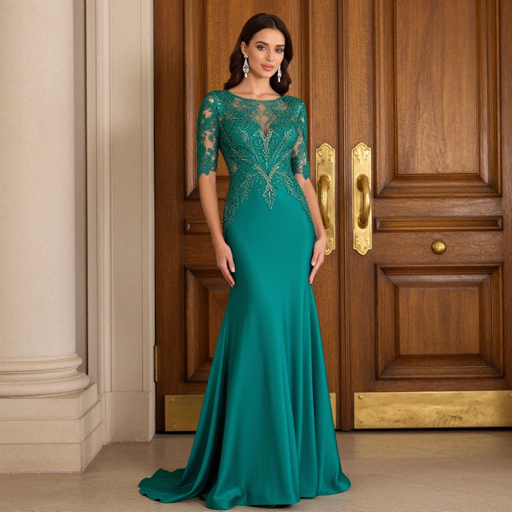 Photograph of a young woman with medium skin tone and dark, wavy hair standing in front of a wooden door with gold handles. She wears a floor-length, teal evening gown with a sheer, beaded lace bodice and cap sleeves, highlighting her slender figure. The gown has a subtle train. She accessorizes with dangling earrings. The background includes a white column on the left and a tiled floor. The lighting is natural, enhancing the rich color of the dress and the wood's warm tones. She stands with a composed, confident expression.