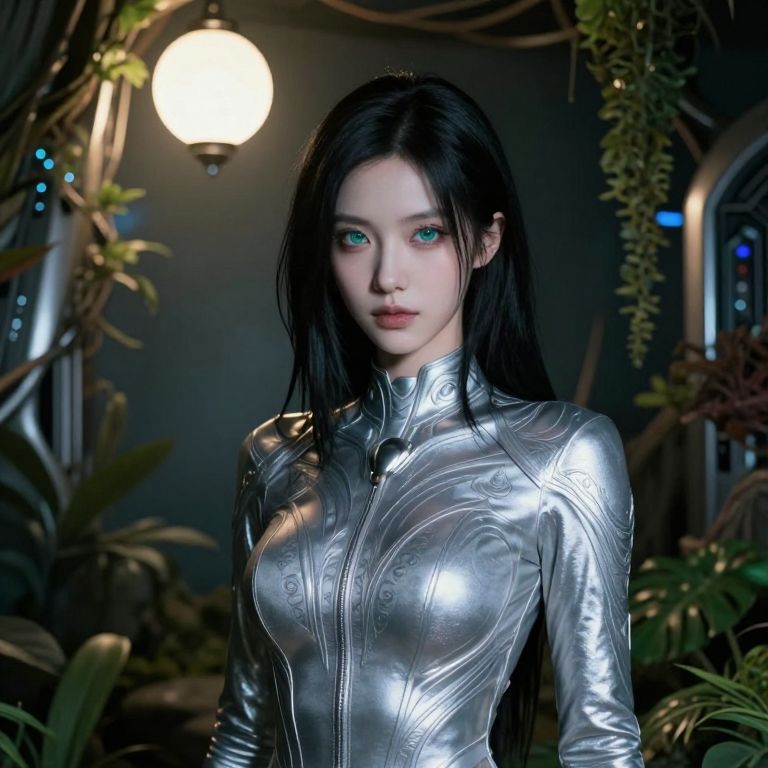 Craft an ultra-detailed, photorealistic portrait showcasing a figure with captivating blue-green eyes, pale skin, and waist-length jet-black hair. The subject stands in a dimly lit room illuminated by a single glowing orb suspended from the ceiling, casting subtle shadows across their angular face. Their attire is a form-fitting bodysuit adorned with intricate silver patterns that reflect ambient light. The background features an innovative fusion of high-tech and organic elements: sleek metallic surfaces blend seamlessly with lush plant life, creating a serene yet mysterious landscape that evokes intrigue and curiosity. This captivating digital portrait invites viewers to delve deeper into its mesmerizing interplay of colors.