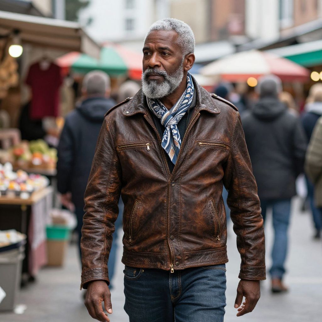 Photograph of an older white man with gray beard, wearing a red hat and jacket, sipping a white coffee cup at a bustling outdoor market with