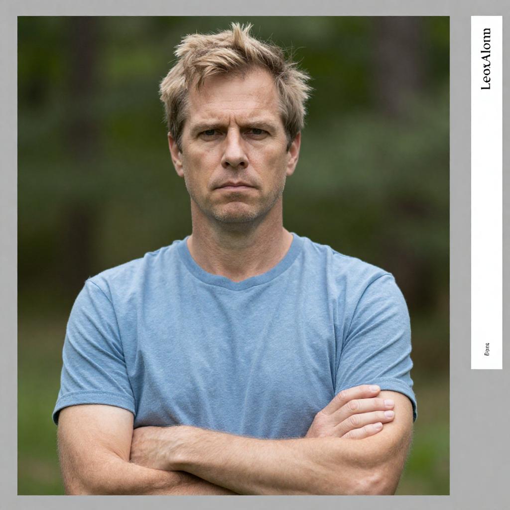 Portrait of a middle-aged man with short, messy blonde hair standing outdoors in front of a blurred green forest background. He is wearing a light blue t-shirt and has his arms crossed, displaying a serious expression.