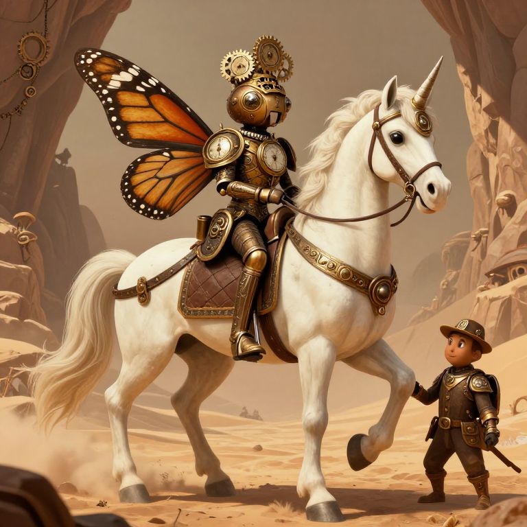 A steampunk-inspired digital artwork depicts an ant-like monarch adorned in ornate armor and a crown crafted from clock gears, riding a majestic unicorn through a cavernous desert landscape, with a loyal attendant in tow, evoking a blend of fantasy and industrial aesthetics.