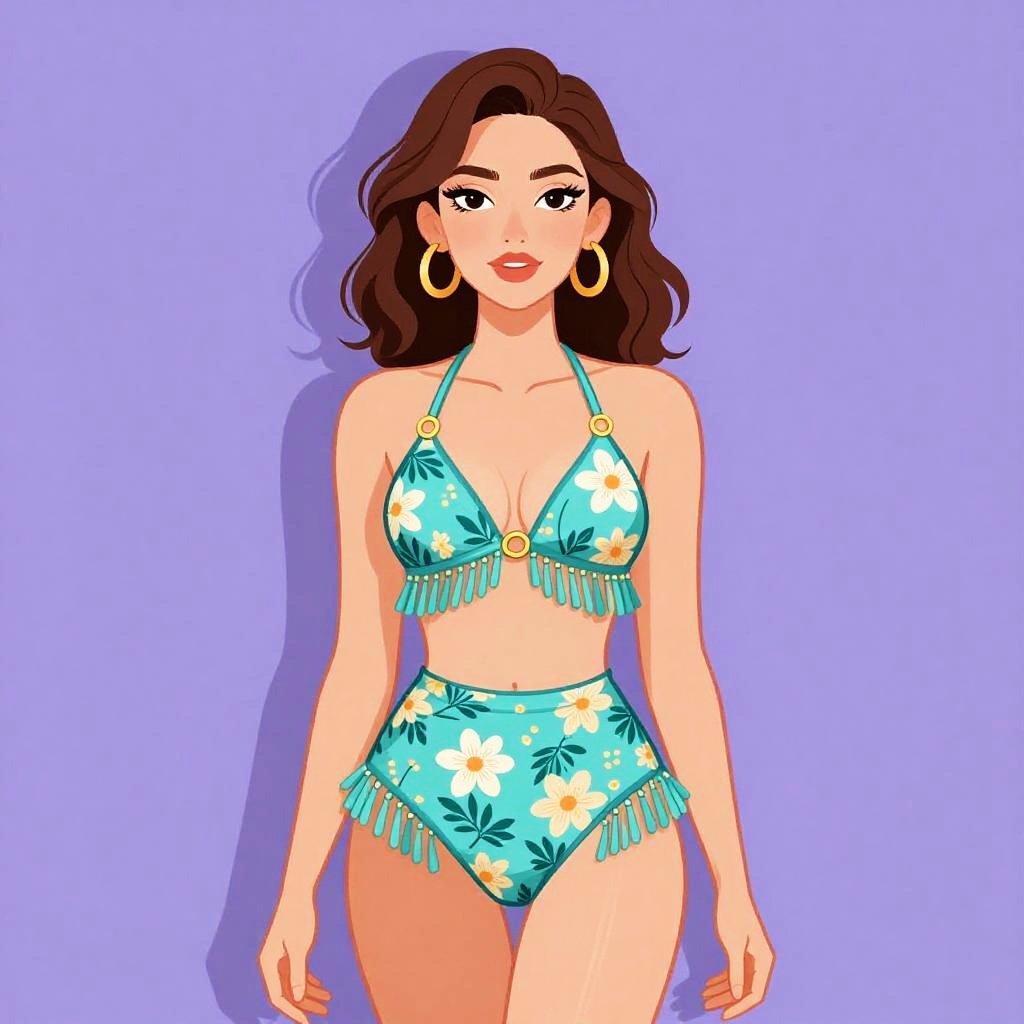 Woman with pretty face and pretty hair. Retro swimwear, high-waisted bikini, vibrant teal fabric, soft nylon blend, intricate fringe details, playful tassels along edges, matching halter top, adjustable straps, gold hardware accents, vintage-inspired floral print, lightweight and quick-drying. --sref 1461