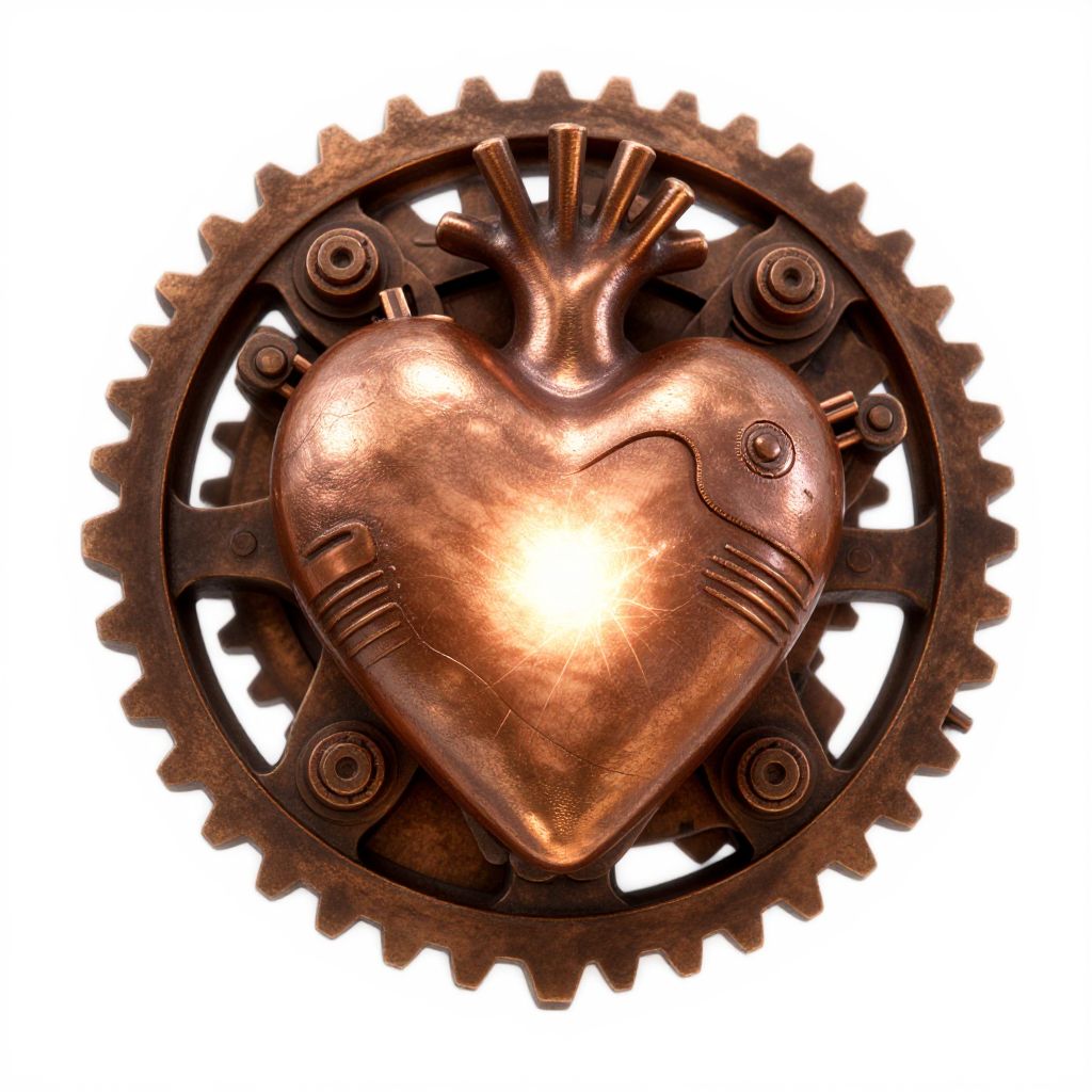 This is a photograph of a metallic, steampunk-style heart-shaped gear. The heart, made of copper with a shiny, slightly worn texture, is centered within a larger, brown, gear-like structure with evenly spaced teeth. The heart features intricate details, including grooves on its sides and a small, circular indentation on its upper left. The copper heart has a reflective surface with a bright spot near its top, adding a touch of light. The background is plain white, highlighting the intricate design and metallic textures of the gear and heart. The overall style is industrial and mechanical.