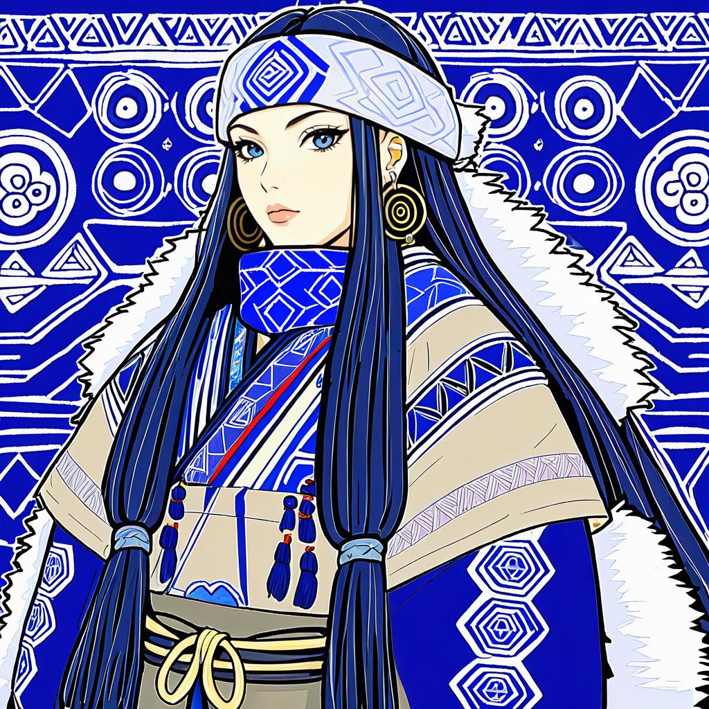 Asirpa, golden kamuy, 1girl, blue eyes, long hair, black hair, ainu clothes, ainu clothes, fur cape, long sleeves, hoop earrings, ainu, blue bandana, headband, by artist ishihara masumi, leet