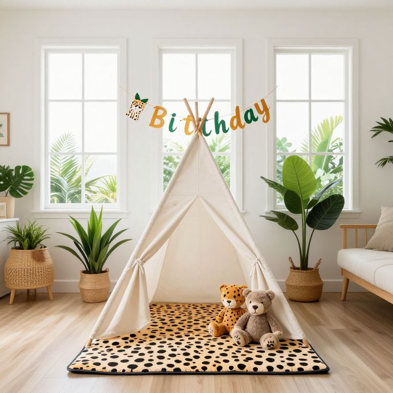 Cozy teepee tent set up in a bright room with three windows, featuring a \"Birthday\" banner, a cheetah-patterned mat, plush toys, and surrounded by plants and furniture, creating a festive jungle-themed birthday party space.