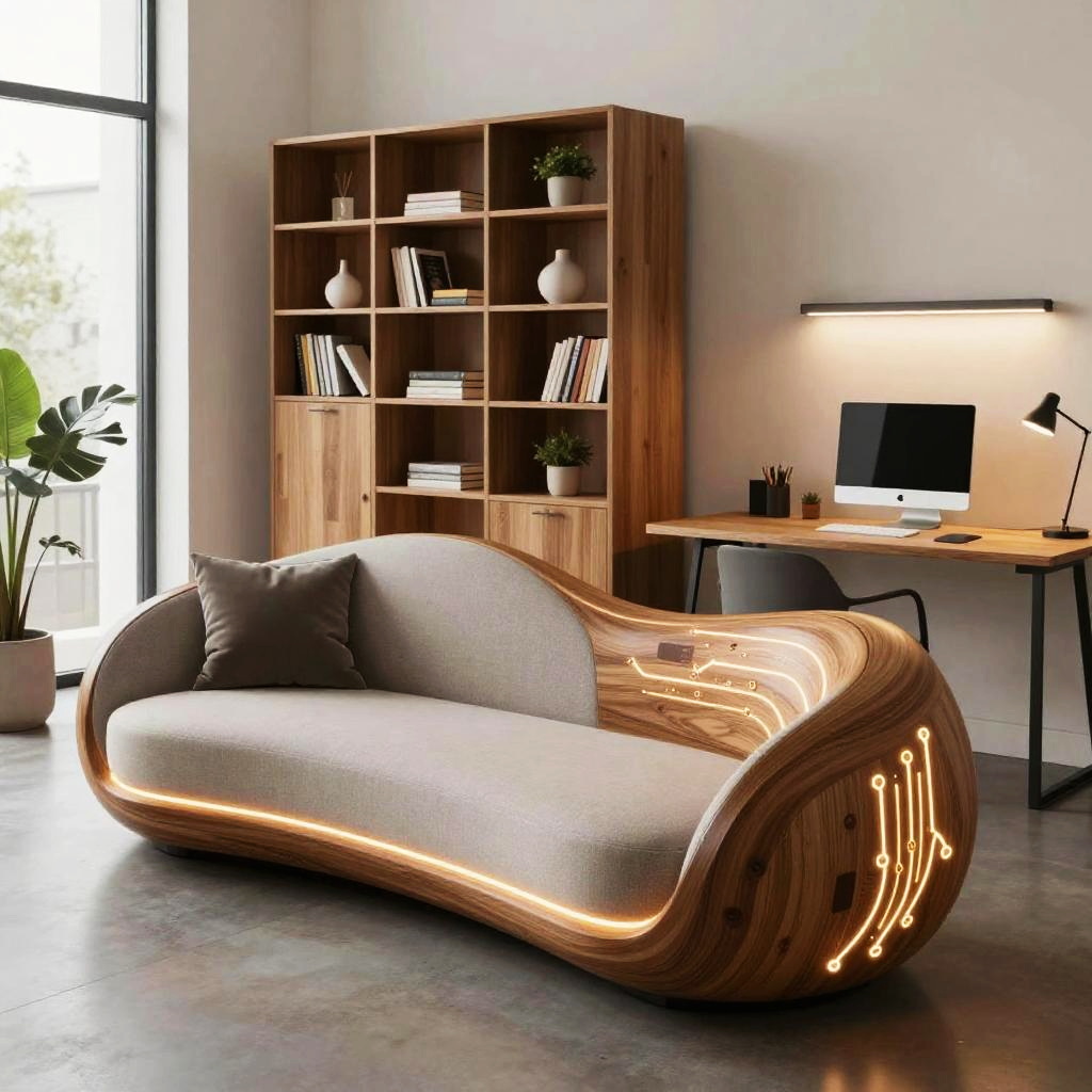 AI furniture generator creating innovative home interiors with dynamic AI-designed couches, smart storage units, and adaptive desks, glowing circuits subtly integrated into wood and metal textures, digital art style with neon highlights and soft shadows