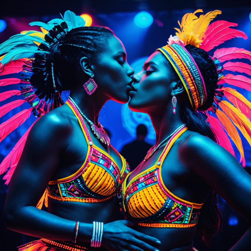 Screen Printing a vivacious samba dancer kissing her twin, hyperdetailed, colorful neon lighting, 8k resolution
