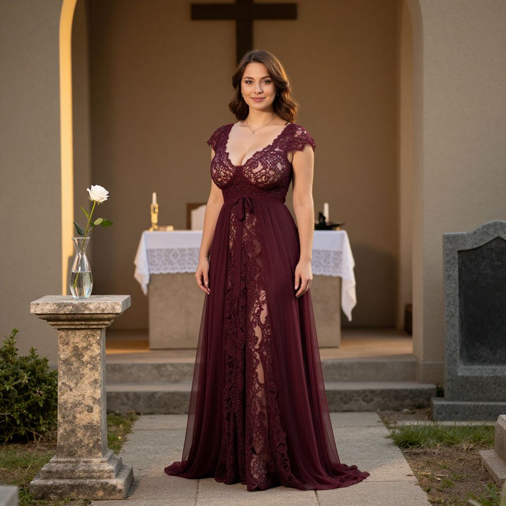 A serene and elegant woman in her late 30s with soft brown hair, kind eyes, and a gentle smile stands at a quiet cemetery chapel, wearing a beautifully detailed funeral dress with flowing lace and deep maroon fabric, the setting bathed in golden twilight with a single rose in a glass vase on a stone pedestal.. The woman has big breasts and cute face