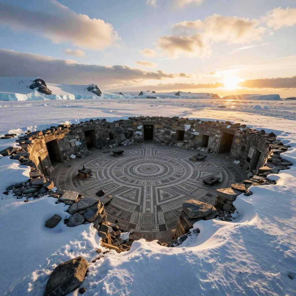 Antarctica ancient ruins hidden beneath melting ice sheets, mysterious stone structures with carvings, surrounded by snow and glaciers under a twilight sky, cinematic lighting