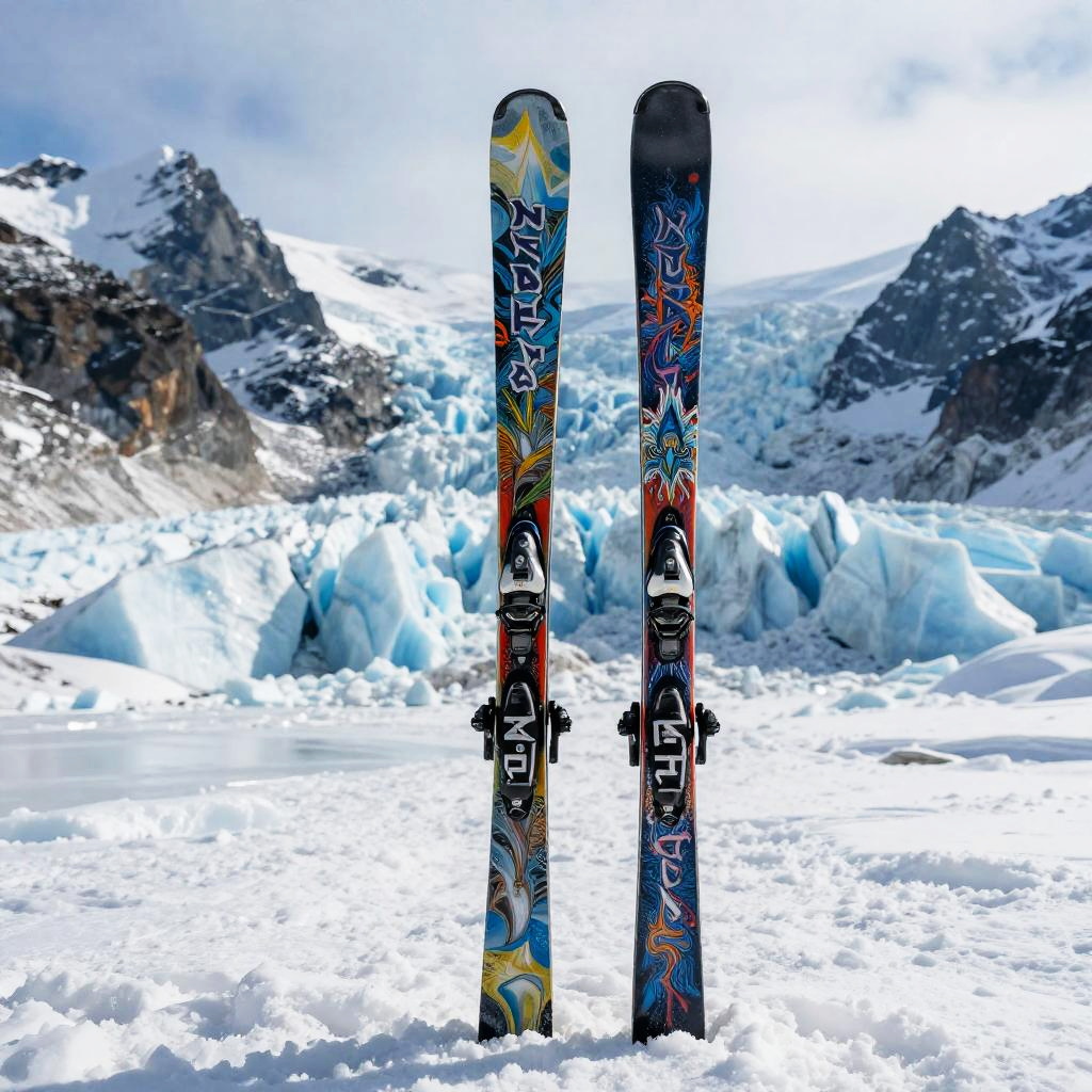 Iron maiden skis showcased prominently on a glacier with icy blue peaks in the background, vibrant and elaborate heavy metal artworks on the skis, metallic textures reflecting sunlight, pristine snow, atmospheric cold mountain environment, artistic and edgy style.
