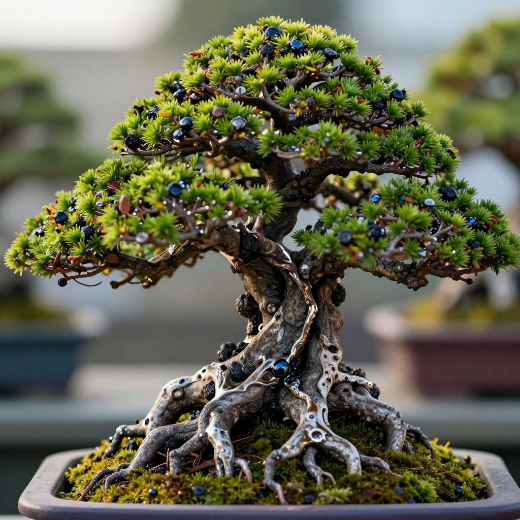 Photograph of a meticulously pruned bonsai tree with a twisted, gnarled trunk and dense, bright green foliage. The tree's roots are exposed, showcasing intricate, winding patterns. Small blue berries are scattered among the leaves. The bonsai is planted in a square, light brown pot filled with green moss. The blurred background features additional bonsai trees in varying shades of green, suggesting an outdoor garden setting. The image is sharp with vivid colors and a shallow depth of field, emphasizing the bonsai as the focal point.