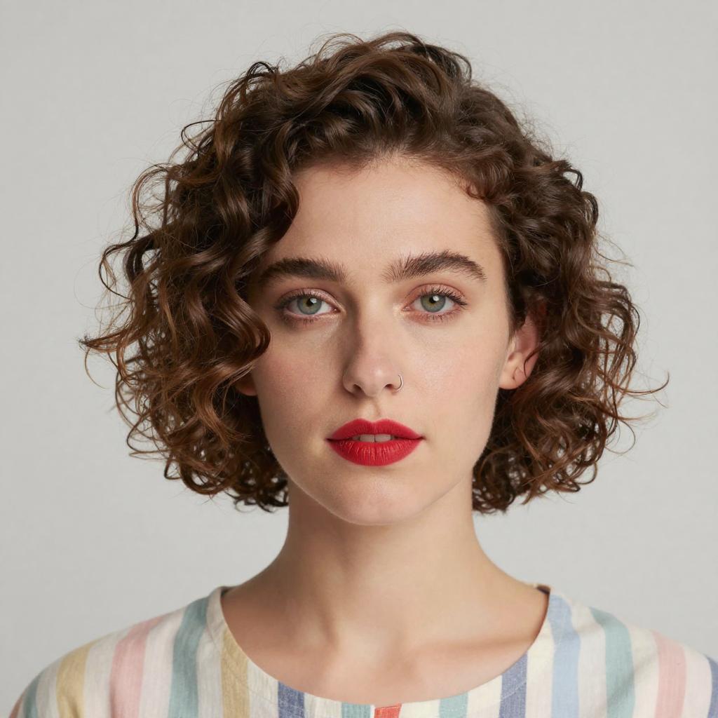 Photograph of a fair-skinned woman with short, curly brown hair and green eyes. She has a small nose ring in her left nostril and is wearing bright red lipstick. Her makeup is subtle, with defined eyebrows and light eyeliner. She's dressed in a striped shirt with pastel colors. The background is a plain, light gray, making her the focal point. Her expression is neutral, slightly looking to the side.